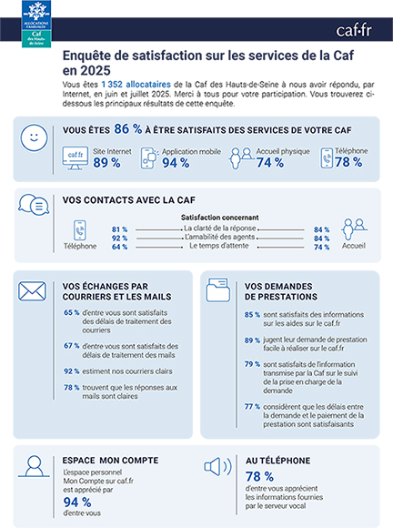 En 2025, vous étiez près de 1 500 allocataires des Hauts-de-Seine à avoir participé au baromètre national de satisfaction. Cette enquête, menée tous les trois ans, permet de mesurer la qualité perçue de nos services et l’évolution de vos usages.