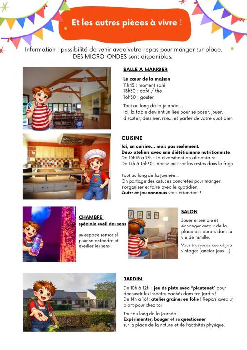 Tout au long de la journée vous êtes invités à circuler librement d'une pièce à l'autre, expérimenter, observer, ressentir, échanger avec des professionnels et d'autres familles, déposer vos idées, questions et expériences.