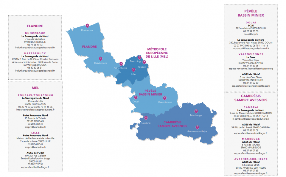 L'ensemble des coordonnées sont disponibles sur la carte de la Fédération Française des Espaces de Rencontre pour le maintien des relations enfants-parents (FFER).