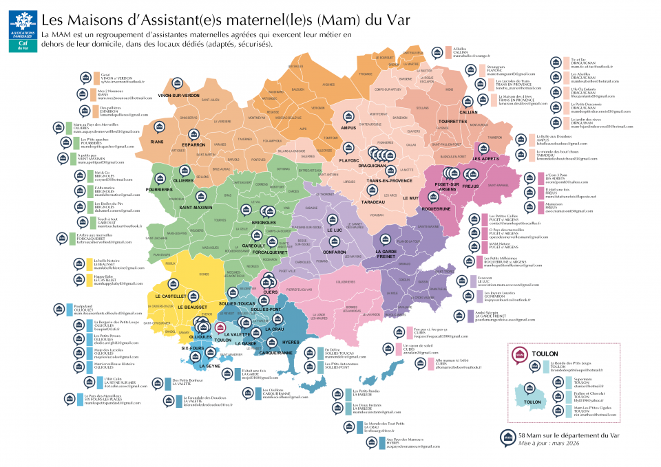 Vous pouvez consulter la liste des Relais Petite Enfance présents sur le département du Var sur le site monenfant.fr, ainsi que sur la cartographie.