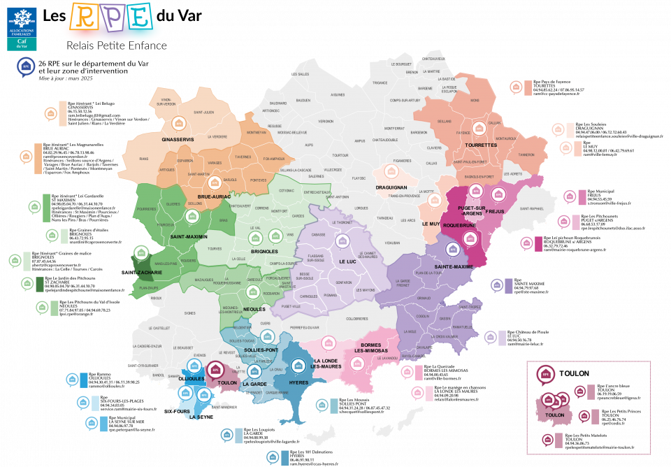 Vous pouvez consulter la liste des Relais Petite Enfance présents sur le département du Var sur le site monenfant.fr, ainsi que sur la cartographie.