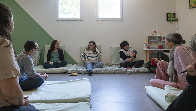 La porte s’ouvre et laisse entrer un petit flot de poussettes. À l’intérieur, une odeur de café se diffuse et Audrey Chanonat, coprésidente de La Cause des parents, accueille les participants : « Bienvenue aux moments partagés du jeudi matin. » Pendant deux heures, une dizaine de parents, nouveaux venus ou déjà membres, vont échanger sur les joies et les difficultés de la parentalité dans les locaux de cette association de soutien à la parentalité et à la périnatalité établie à Villeurbanne. Arrivé le premier, Sébastien prend place dans la salle. La santé mentale est un sujet qui lui parle énormément : papa d’un petit garçon de 2 ans, Sébastien a fait une dépression post-natale et peine encore à trouver ses marques dans sa nouvelle vie de père. Il se rend régulièrement ici pour partager avec d’autres parents, et y trouve un réel réconfort. Anne Roussel, bénévole de l’association, est la facilitatrice de la matinée : « Nos échanges sont informels. Les sujets varient en fonction des participants, on discute, on partage, toujours dans la bienveillance, en essayant d’apporter une aide dans ce moment où, parfois, l’épuisement prend le pas sur le bonheur d’accueillir un enfant. »