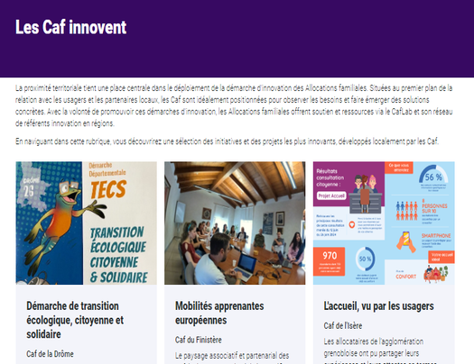 La page Innovation du site caf.fr s’enrichit d’une nouvelle rubrique intitulée "Les Caf innovent", qui fait la part belle aux initiatives et projets innovants portés par les Caf partout sur le territoire.
