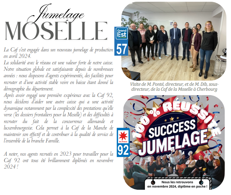 Actuellement 14 Gestionnaires Conseils Allocataires ont été recruté par la CAF de la Manche et travaillent pour les CAF 92 et 57 dans le cadre des jumelages de productions.