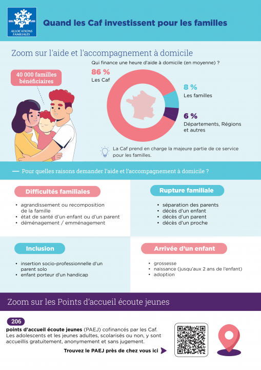 Chaque année, elles investissent 7,4 milliards d’euros et cofinancent plus de 100 000 équipements et services pour soutenir les familles, ou non, partout en France. Crèches, centres de loisirs, centres sociaux, médiation familiale, aide à domicile… Ces dispositifs visent à prévenir les inégalités, favoriser l’inclusion et accompagner les familles dans les moments clés de leur vie.