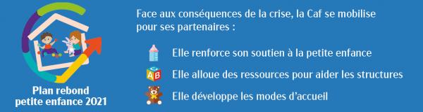 La branche Famille de la Sécurité sociale a mobilisé des moyens conséquents pour soutenir les équipements et services à la population. En mars 2021, la Caisse nationale des allocations familiales a annoncé un soutien renforcé du secteur de la petite enfance à hauteur de 200 m€ grâce à un plan rebond. Les mesures de ce plan rebond ont été prolongées en 2022, avec un financement complémentaire de 50 m€ au niveau national.