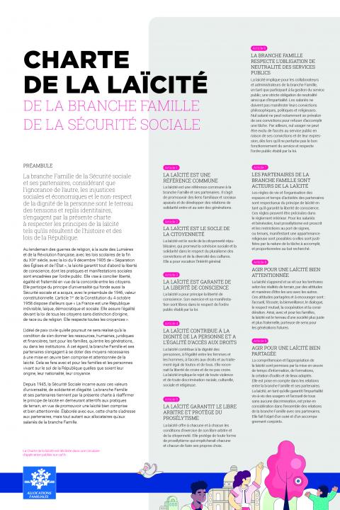La Branche famille et ses partenaires, considérant que l'ignorance de l'autre, les injustices sociales et économiques et le non-respect de la dignité de la personne sont le terreau des tensions et des replis identitaires, s'engagent par la présente charte à respecter les principes de la laïcité tels qu'ils résultent de l'histoire et des lois de la république.