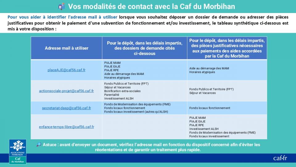 Afin de faciliter le traitement de vos demandes et d’assurer une prise en charge optimale de vos dossiers, la Caf du Morbihan met à votre disposition plusieurs boîtes aux lettres partagées (BALP).