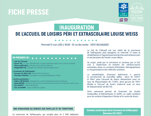 La Caf de l’Hérault est aux côtés de la commune de Vailhauquès pour inaugurer, ce mercredi 12 mars, la réhabilitation et l'agrandissement de d'accueil de loisirs péri et extrascolaire de l’école Louise Weiss.